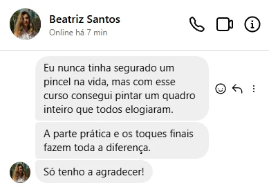O Curso de Pintura em Tela foi criado para quem deseja aliviar o estresse, reconectar-se com suas emoções e desenvolver uma nova habilidade criativa sem pressão, no seu ritmo, mesmo começando do zero..